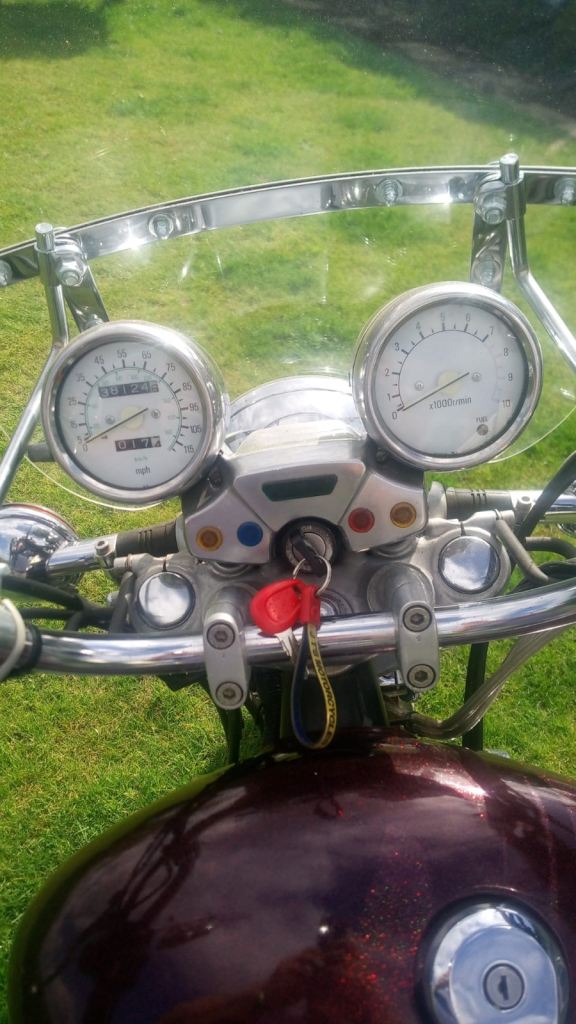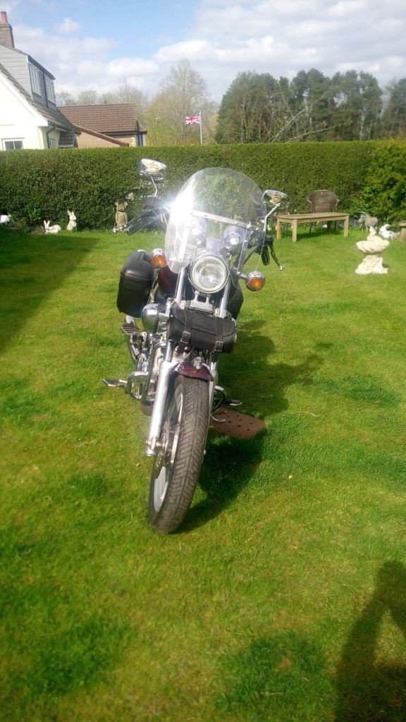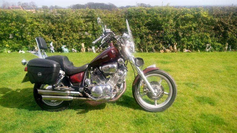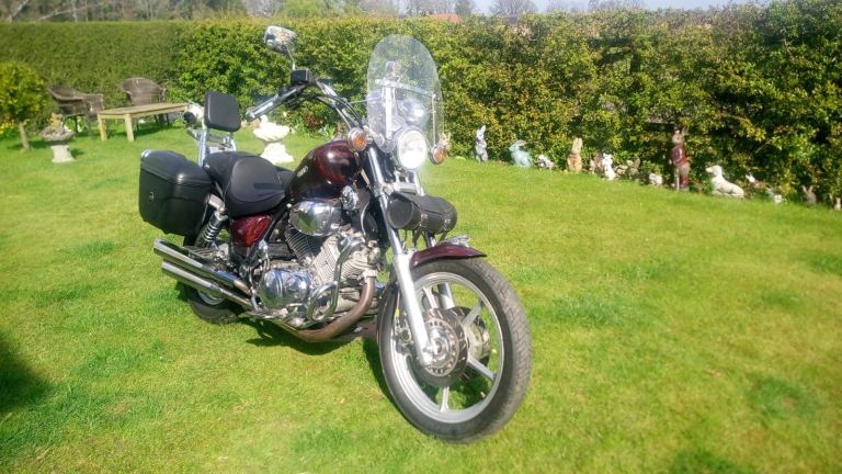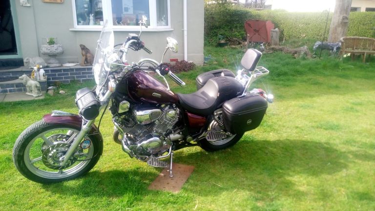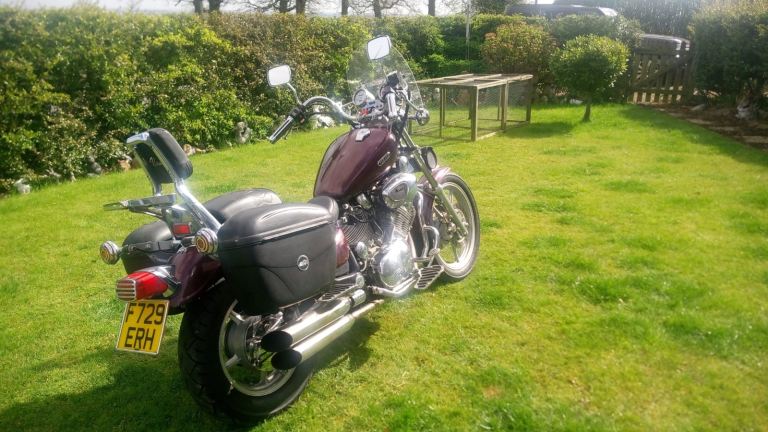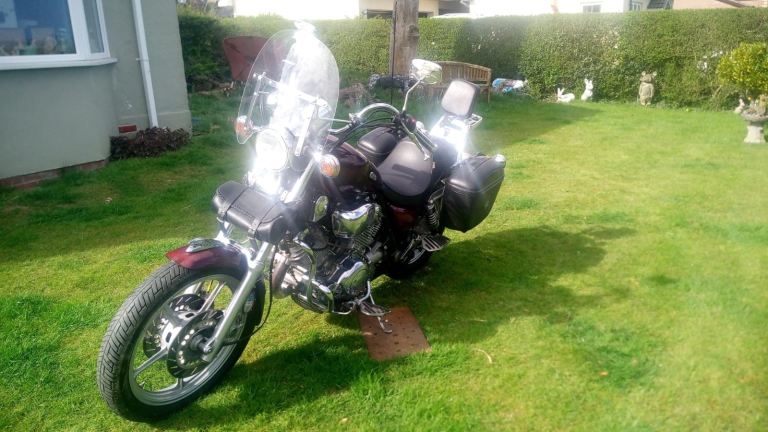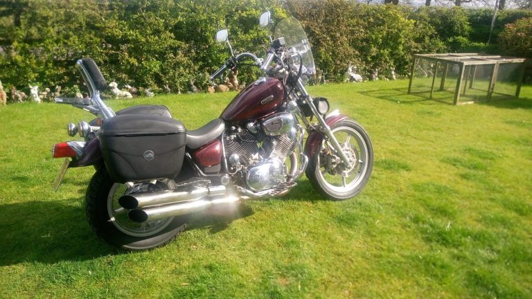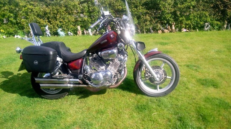 XV1100 virago, 1989, stainless steel exhaust, good tyres, lots of extras- running foot boards, tool role after market custom seat, break and clutch levers aftermarket good quality many bits as well, hard Givi boxes with keys, new cruiser screen, powder coated frame, custom paint, black base red/ rainbow metal flake a real eye catcher. shaft drive as standard so no chain to worry about