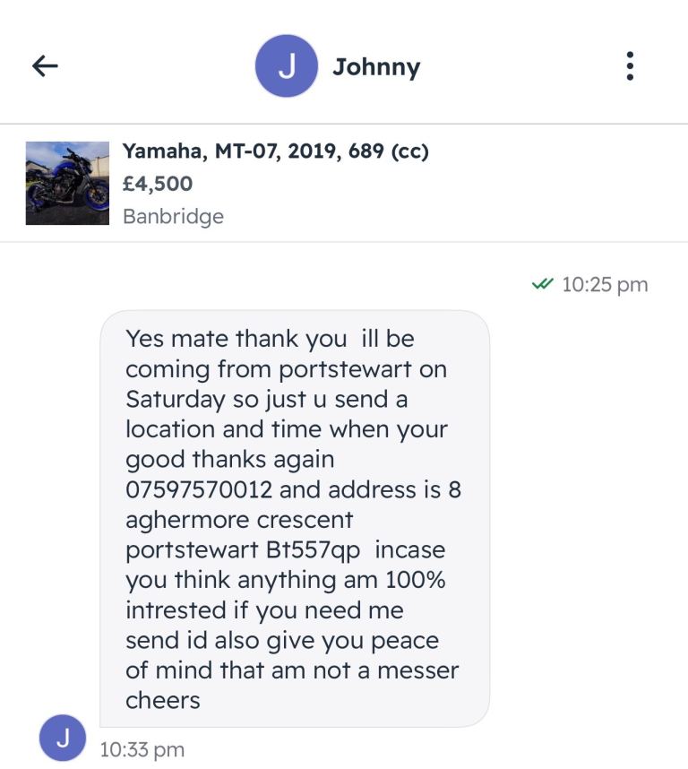 If your names Johnny from portstewart and you send messages like this but forgot to ask the wife if you where allowed the bike then just don’t bother until you’ve spoken to her. Jonny thought he was coming for it until she put him in his box. Not even the manners to send a simple text.. Here’s the message during the week- Yes mate thank you ill be coming from portstewart on Saturday so just u send a location and time when your good thanks again (number in pics) and address is 8 aghermore crescent portstewart Bt557qp incase you think anything am 100% intrested if you need me send id also give you peace of mind that am not a messer cheers