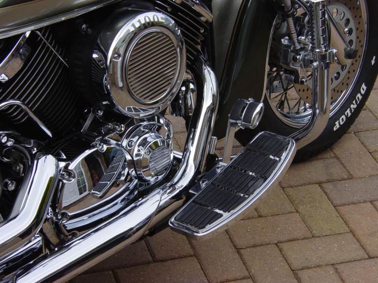 It has MUSTANG Silicon Rider and Pillion Seats, Bullet chrome screen, Large Tool Bag on the back, upgraded foot pegs, Mirrors, Spot lights, Front Fender Light, Part Leather tank cover, Sissy Bar, Saddle Bags, Twist Grips, Crash Bars etc etc and the list goes on.