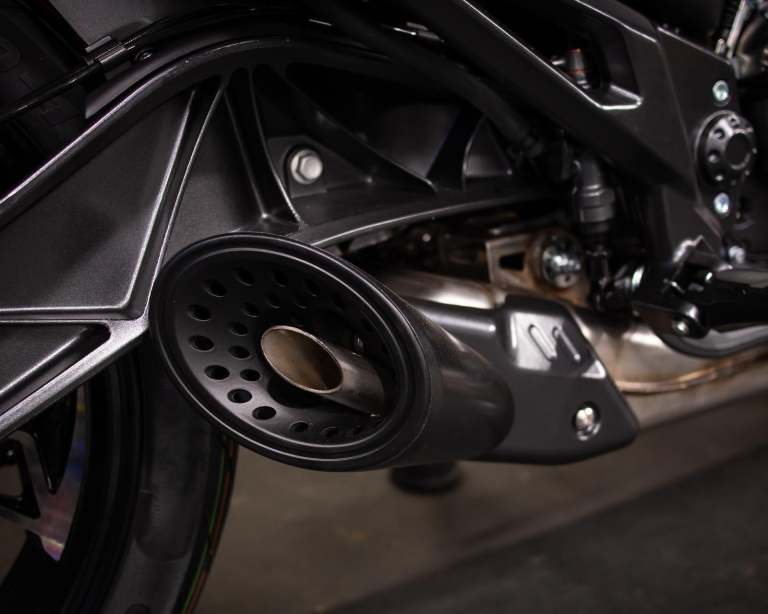 Discreetly under-slung, the full stainless steel exhaust system is designed for a long service life, with the exit pipe shrouded in a cool-touch cover to avoid burning you stylish riding kit.