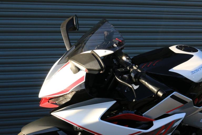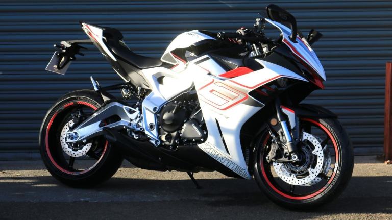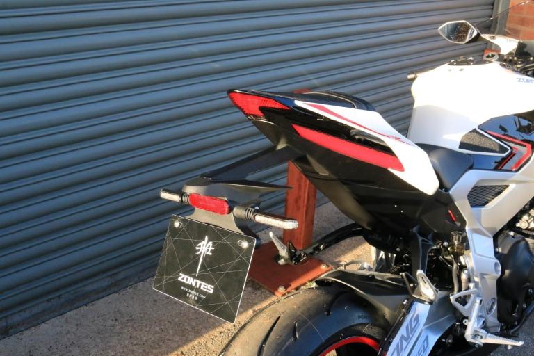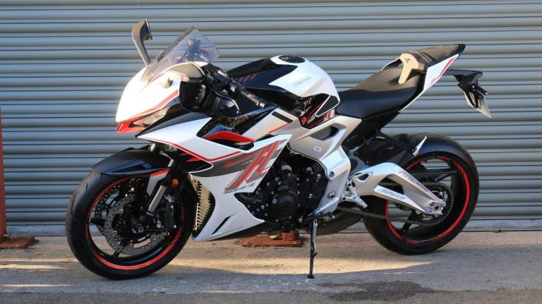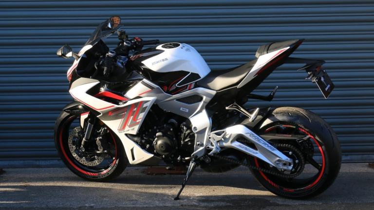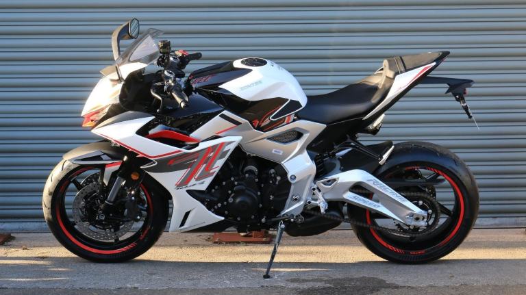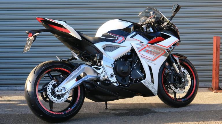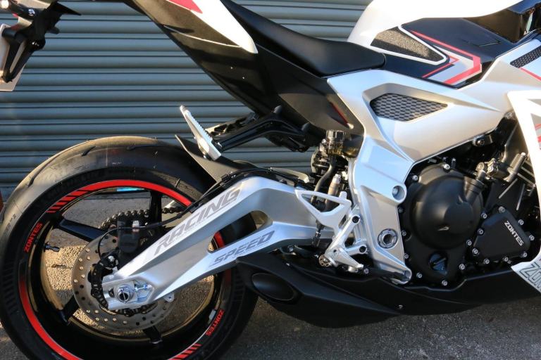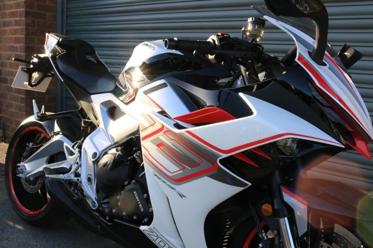 This is the one you've just seen at Motorcycle Live and we have one in stock!! The first thing that stands out about the ZT703-RR is its sporty, stylish, and aggressive design. The sharp lines of its bodywork, enhanced by spectacular LED lighting, give the motorcycle a unique sense of dynamism. At Zontes, the integration of form and function is paramount. For the most demanding enthusiasts, the ZT703-RR is a true technical delight. Marzocchi supplies the high-end suspension. The inverted fork is adjustable in preload, rebound, and compression, while the rear monoshock, which operates on a progressive linkage system, is adjustable in preload and rebound., The braking system is exceptional, with J Juan four-piston radial-mount front calipers and radial pumps featuring on the ZT703-RR. Together with 300 mm semi-floating discs, they guarantee top-quality braking without compromising handling. The advanced Michelin tyres ensure optimal grip in all circumstances. , Incredible spec including Zontes's own a 699cc triple engine with slipper clutch and quickshifter, removal aluminium subframe, Ram air duct, banana style in house designed and manufactured swingarm, Marzocchi USD progressive suspension with pre load adjustment and extension rods, low slung exhaust, RK chain, aero bodywork, configurable 6.75 TFT screen with phone connectivity and mirroring, tyre pressure and temperature display, riding modes, heated grips, traction control, keyless ignition and USB A and C sockets., 24 months warranty, 2 seats, White, Viewing available 24/7 call 01246221742 or [Phone number removed]/[Phone number removed].Usual dealer facilities available