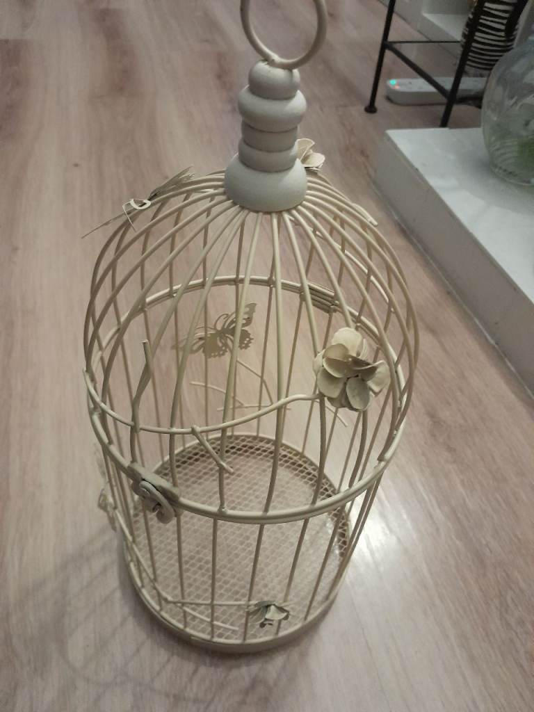 This is a large, black metal bird cage in excellent condition.