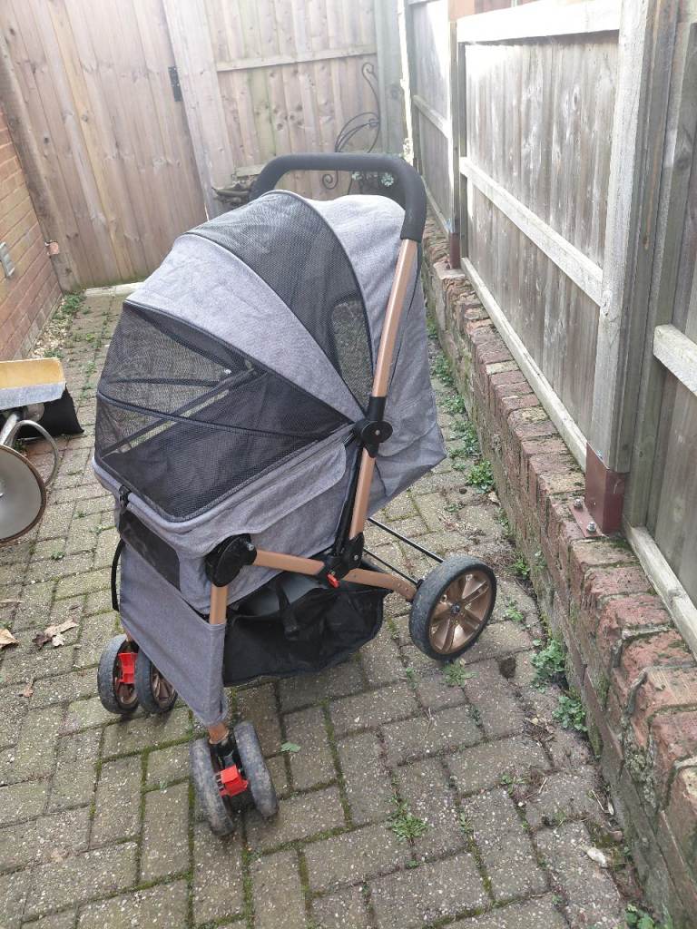 There are no specific legal requirements for using a pet stroller in public spaces in the UK. However, you are responsible for your pet's behaviour and ensuring it doesn't cause a nuisance or danger to others. Always be mindful of pedestrians and other users of public spaces, and clean up after your pet if necessary. Check local council by-laws for any specific restrictions in parks or other designated areas.