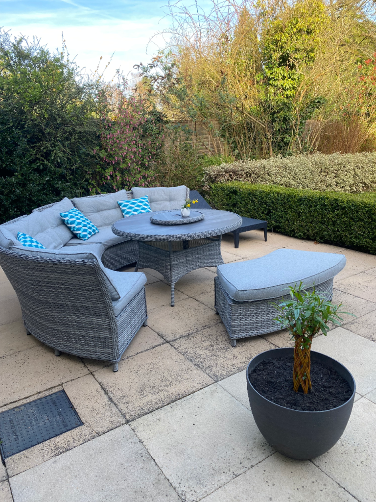 Large round patio set… hardly used. Seats up to 10 people. Grey rattan with fabric cushions. Only 18 months old. Cost £1600. Sell for £800. Buyer to collect. Excellent condition like new. Has another seat to match the other seating to form