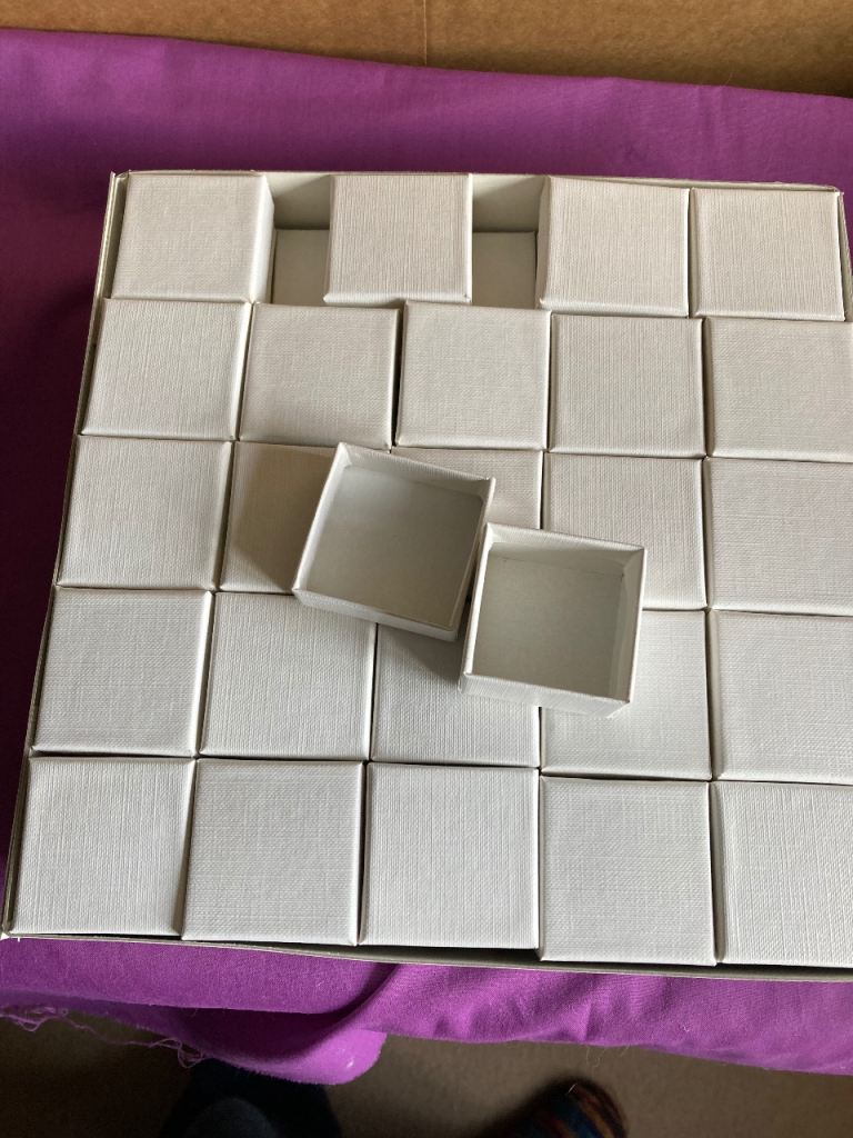 Brand new ring boxes - a few may have slight blemishes due to storage White linen effect sturdy cardboard No inserts Approx 4.5 cm square