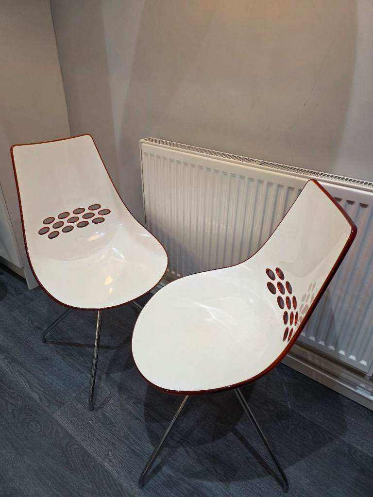 Stylish Italian chairs, eye-catching design, white and orange palette, quality plastic backrest and metal legs. Height 86cm, Seat 43 cm, width 47cm.