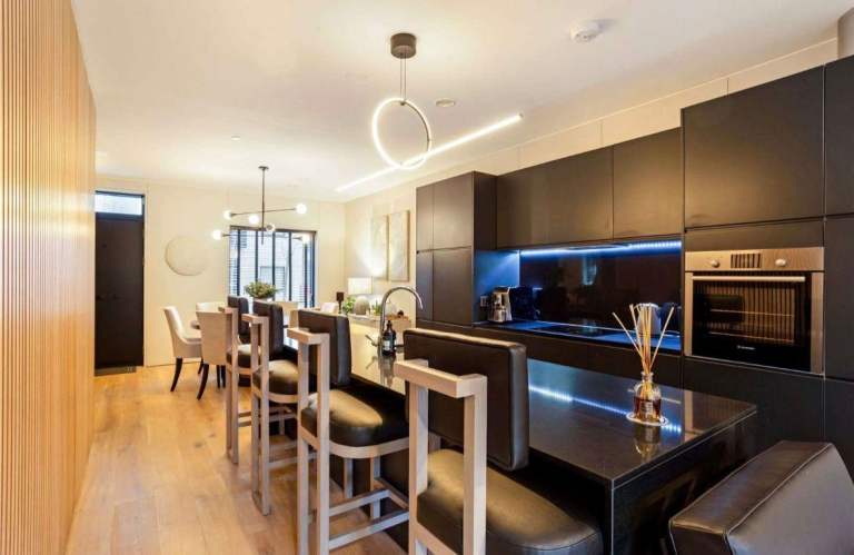 Measure the surface height (floor to underside) and aim for 25–30cm of clearance from seat to countertop.