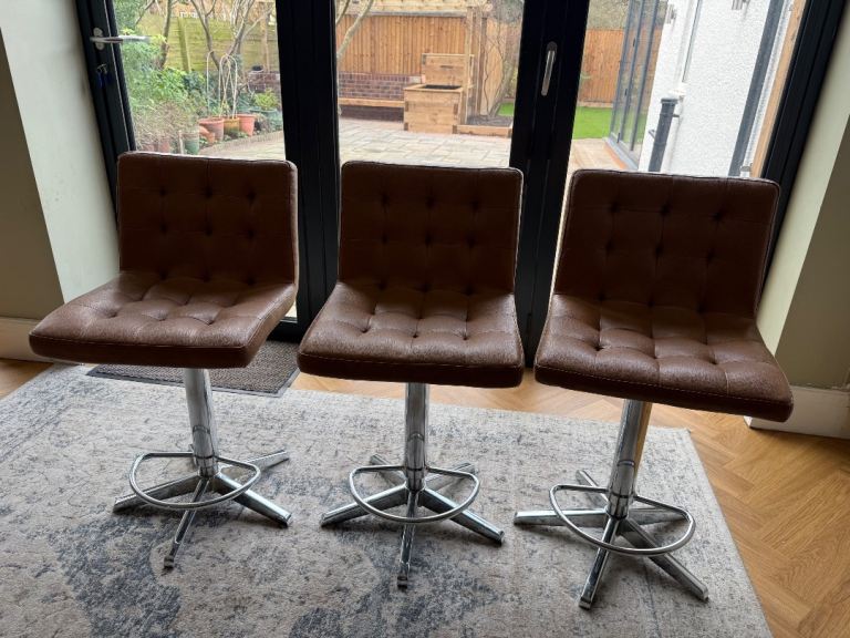 Brown leather effect barstools with foot rest, chrome metal base and, 3 available. Adjustable height from 60cm to 84cm. Seat area is 45cm wide, 46cm deep and back rest is 30cm high £10 each or all 3 for £25 Didsbury, south Manchester co