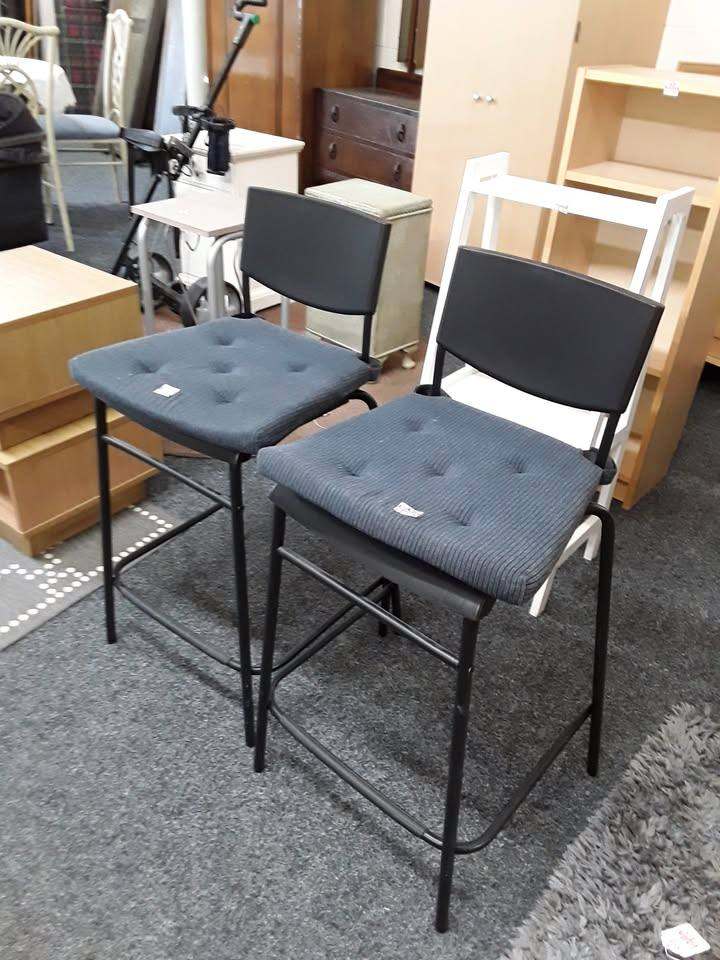 SALE - Was £50 Pair... NOW £27 Pair. These two matching black metal & plastic grey bar stools with seating cushions are in very good all-round used condition... 17 inches wide x 16 inches deep x 35 inches high. Our second-hand furniture mill