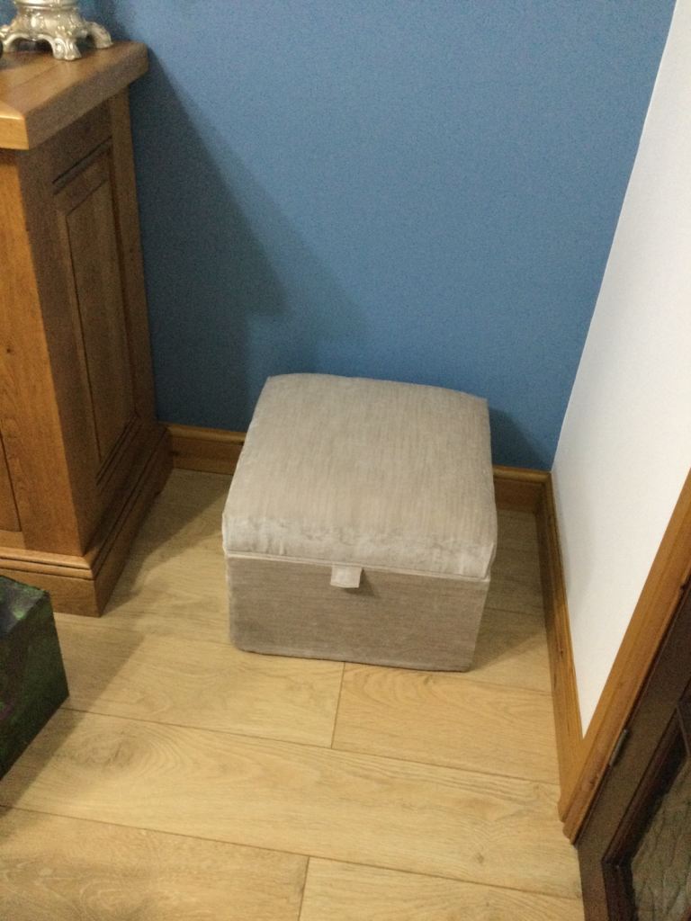 Newly upholstered in beige upholstery fabric. '35 cm high and 47cm square. Lovely storage and footstool.