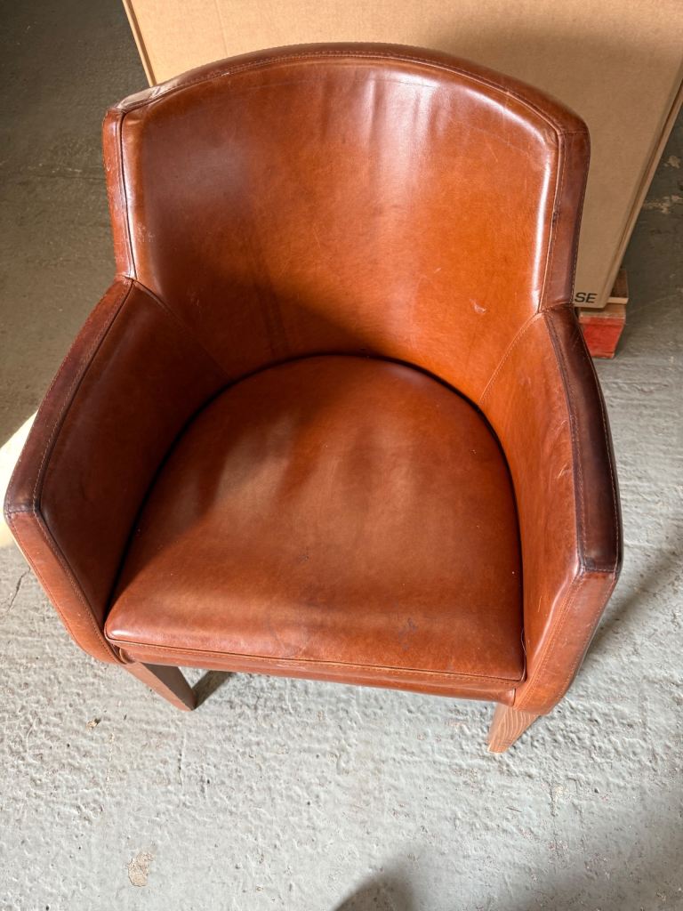 For sale 4 x second hand leather chairs , used but in good condition , brown wooden legs, sold as seen. £45.00 each x 4 chairs
