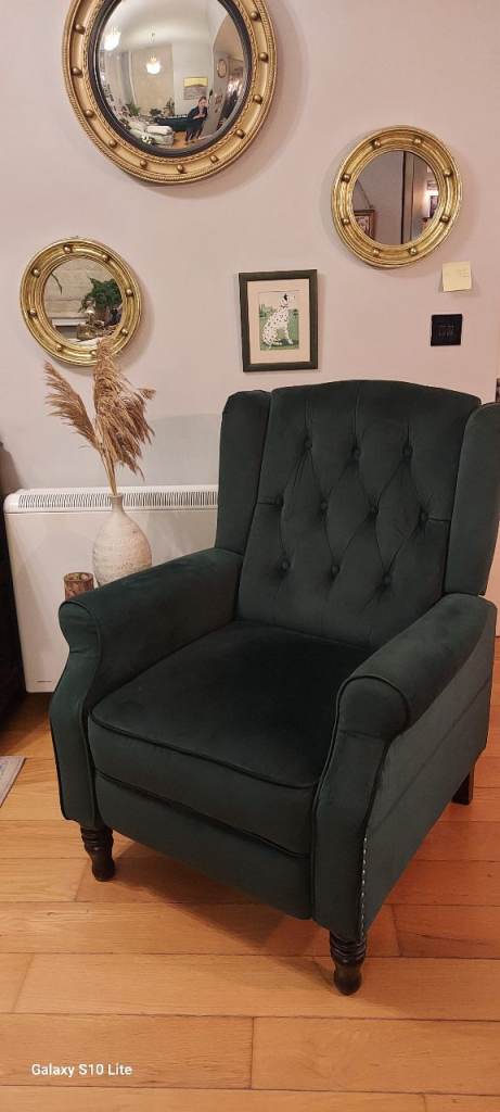Dark green chair with footstool. Changing decor hence sale. Great for all ages. Can be transported in a car. Collection only. A bargain at the price. Yellow cushions not included. Cash payment please.