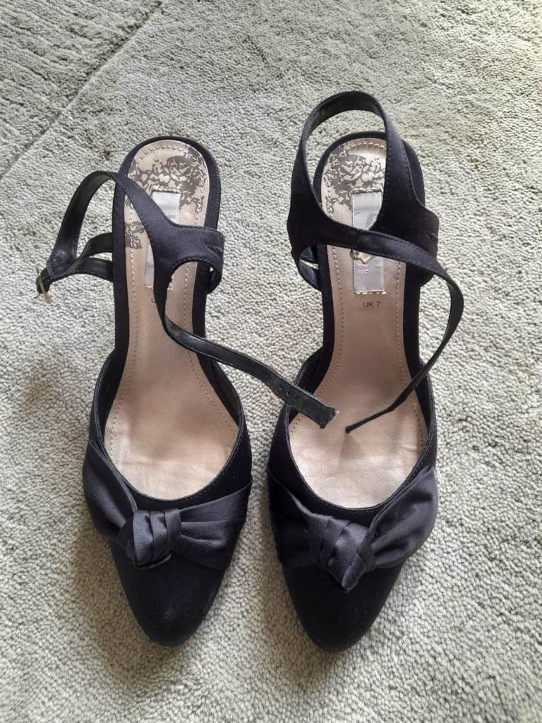 3 pairs of size UK size 7 satin heels, all worn once on various occasions. Black and navy pair £10 each. £15 for pink with matching clutch bag or all 3 for £30 COLLECTION ONLY!