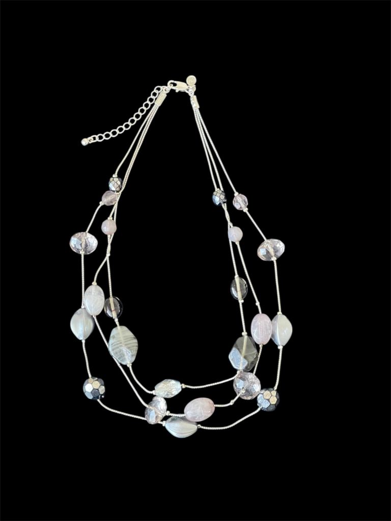 Beautiful Marks & Spencer multi-strand necklace with decorative beads in soft lilac, grey and clear tones. Elegant layered design with different shaped beads creating a stylish statement look. Features: • Silver tone chains • Multi-strand design • F