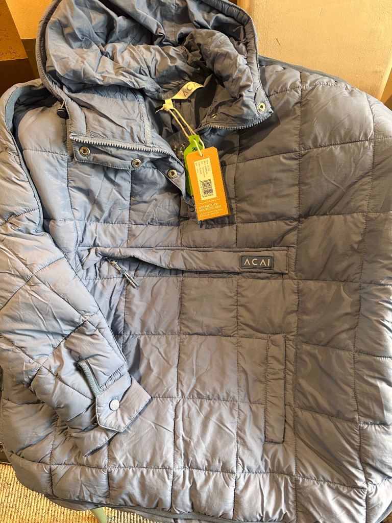 Brand new unworn Açai dusty blue overhead insulated over head jacket. Front zipped pouch pocket and two front pockets. Folds into own stuff sack. Adjustable hood and popper fastening to neck and sleeves. Size 16 but very roomy - would also fit size 1