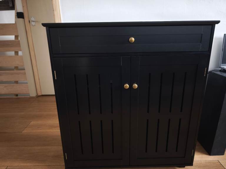 Black storage cabinet in fair condition. Practical and versatile piece of furniture, ideal for the living room, bedroom, hallway, or office storage. The cabinet is sturdy and fully functional. Please note there are a couple of cracks on the doors (p