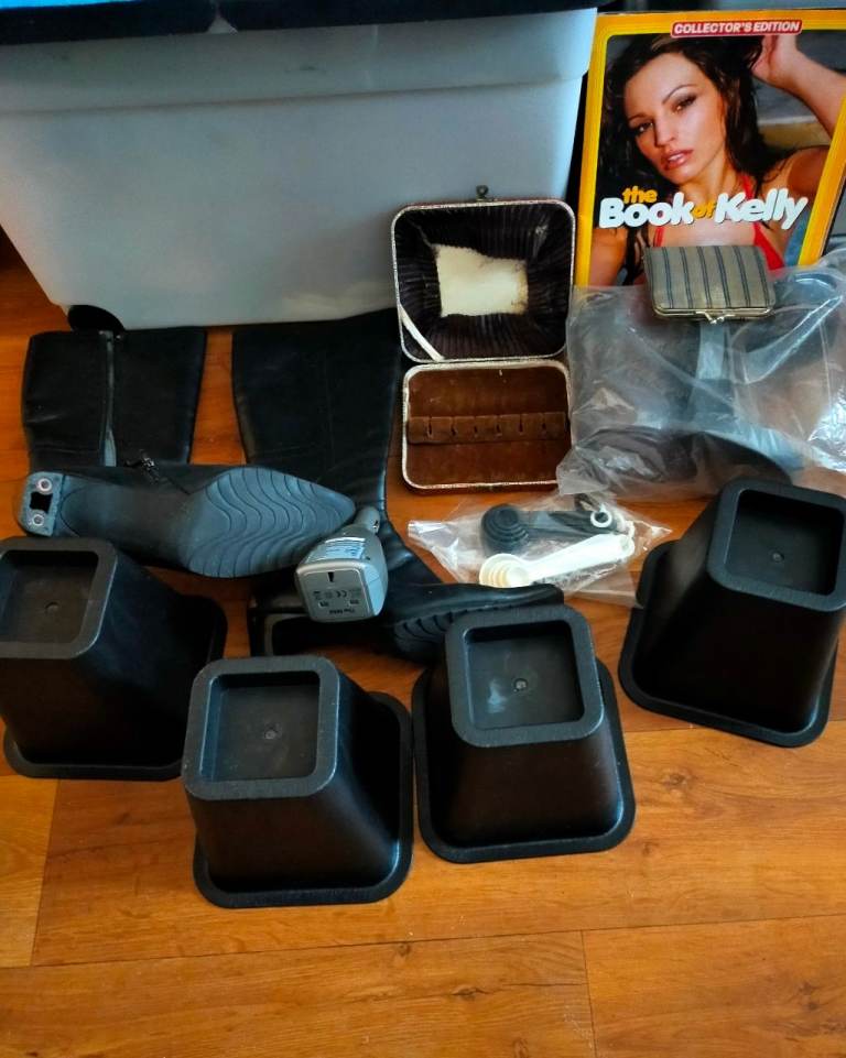 From Smoke Free Home In Excellent to very good condition Ladies Leather Boots Size 4 in excellent condition only thing is that they need a new rubber on the hill as shown in image. Ladies purse, Vintage box that needs to be refurbished. 2 sets of