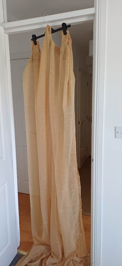 90X89 large Antique Gold tab top Voile curtain (100% Polyester) As New Matching curtain also available but shows signs of wear and tare where it caught on a door but welcome to take if of any use to buyer.