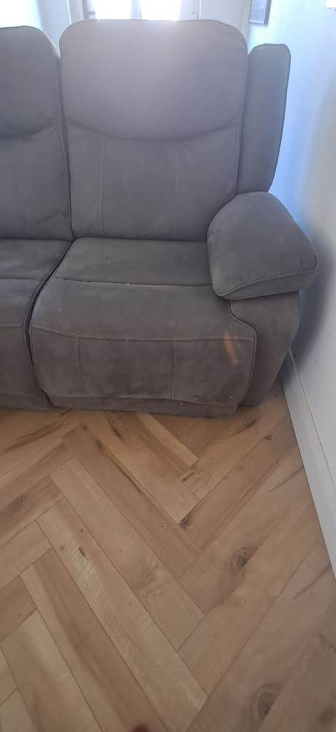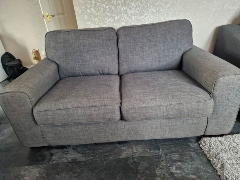 Two seater grey fabric sofa. Clean and comfortable but damaged by cat scratching. 182cm long, 95cm deep, 60cm high.