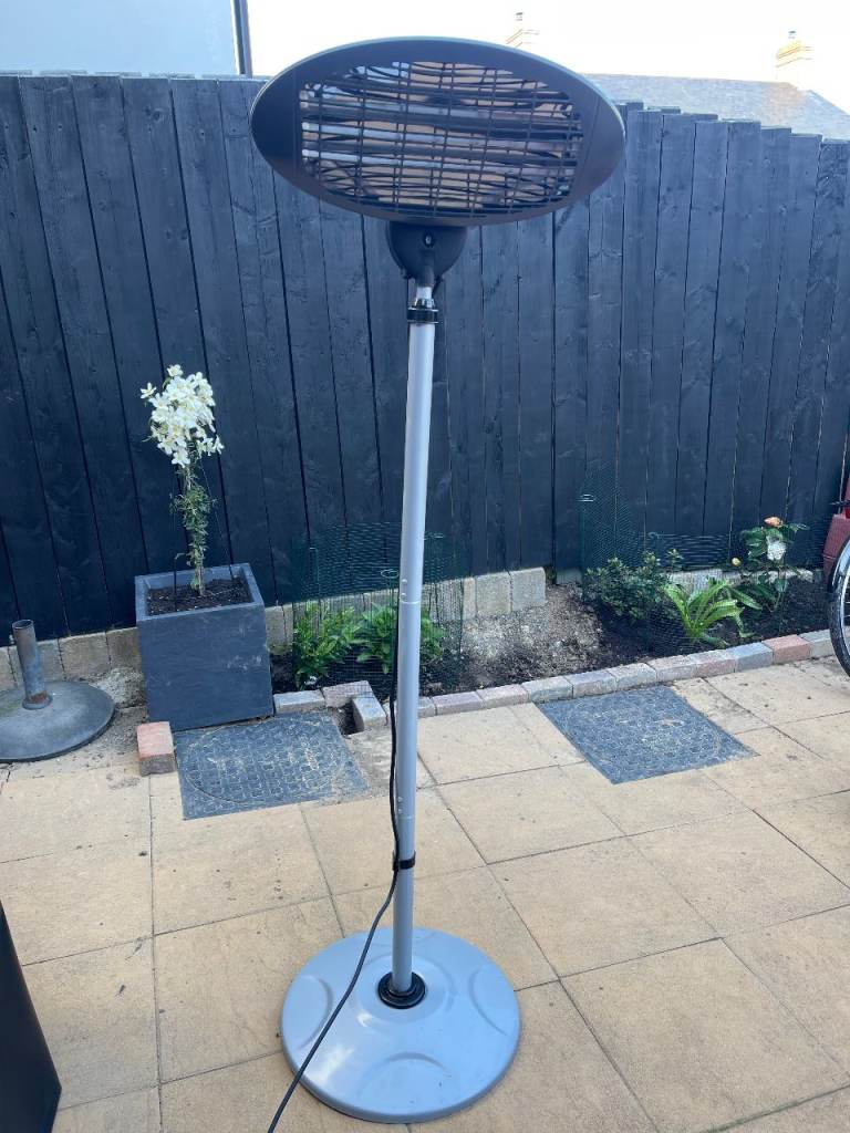 Height adjustable electric patio heater (3 electric bars) Good working order as only used 3 or 4 times Adjust height by turning black fitting shown in photo 4 and moving metal stand up/down to required height. 3 heat settings (see photos 4 and 5) - o
