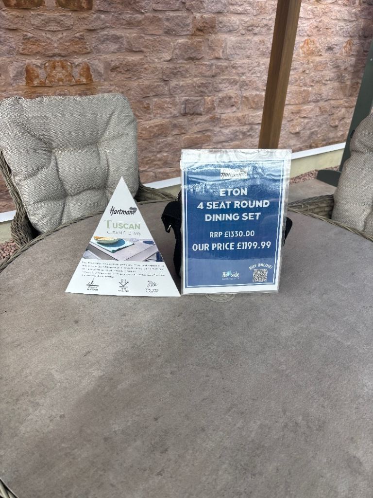 This is a Hartman outdoor dining set that has only been used 5 or 6 times purchased in May 2026 for £1399 it will include all cushions that came with it and also umbrella, as you will see from 2 of the photos todays price new is £1200 so this a real