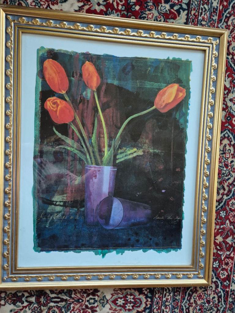 Stunning gold framed piece of art depicting orange tulips in a purple vase. "Egypt/Flowers" Some damage on the corner but not overly noticeable, otherwise great condition See pics Measurements (see pics)
