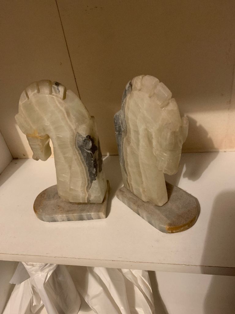 One wobbly but both still good, beautiful, and hefty book ends shaped like the knight piece in chess.