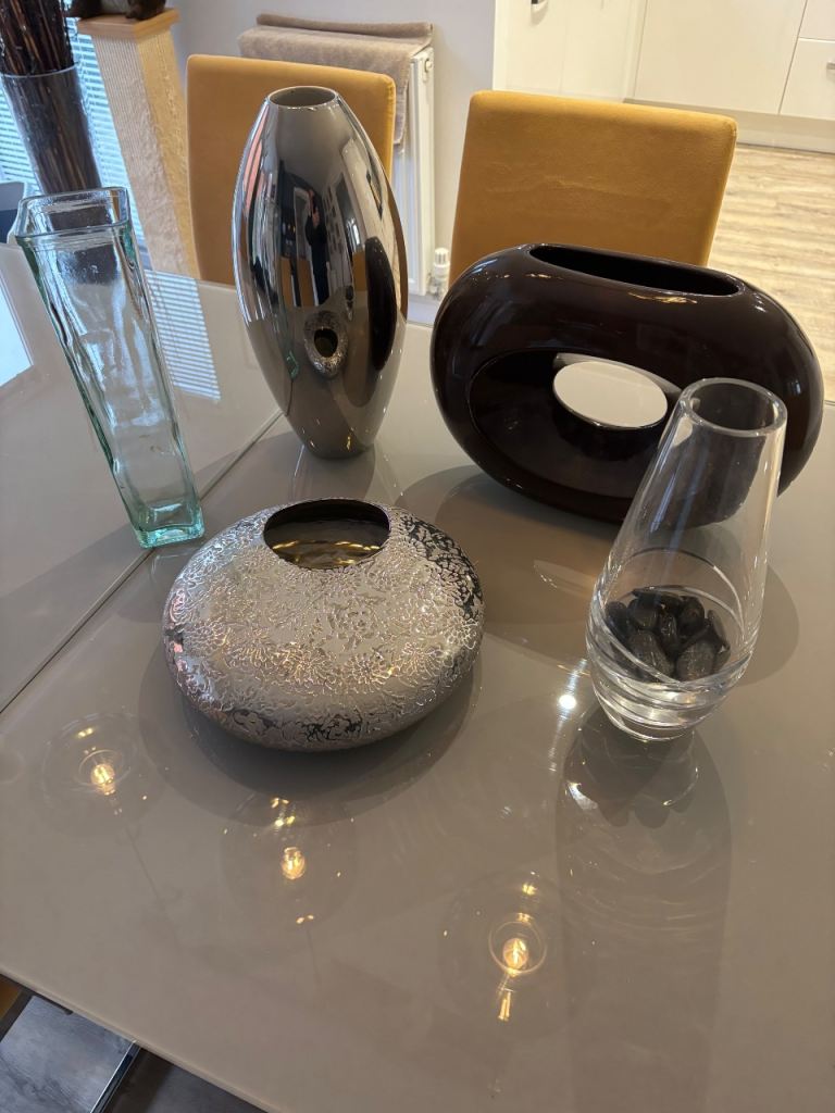 5 vases, (2 quite unusual) for cut or dried flower arrangements, all in excellent condition, no chips or cracks. Silver torpedo vase stands 15" (38cm) high. Flat round silver embossed vase is 12" (30cm) in diameter, with an opening of 4"(11cm) for a