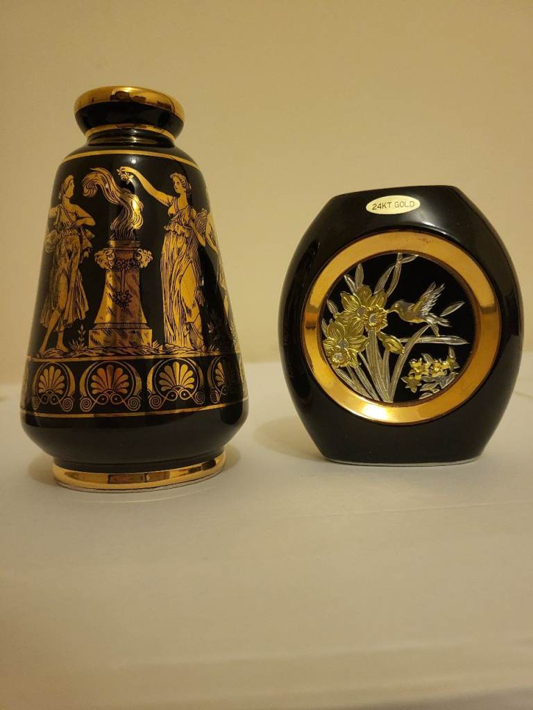 2 small (approx 4") black 24ct gold finish vase urns. Greek. There is a chip on the rim of one of them. Please feel free to message me with questions or offers. Price guided by similar items listed online with chip taken into account.