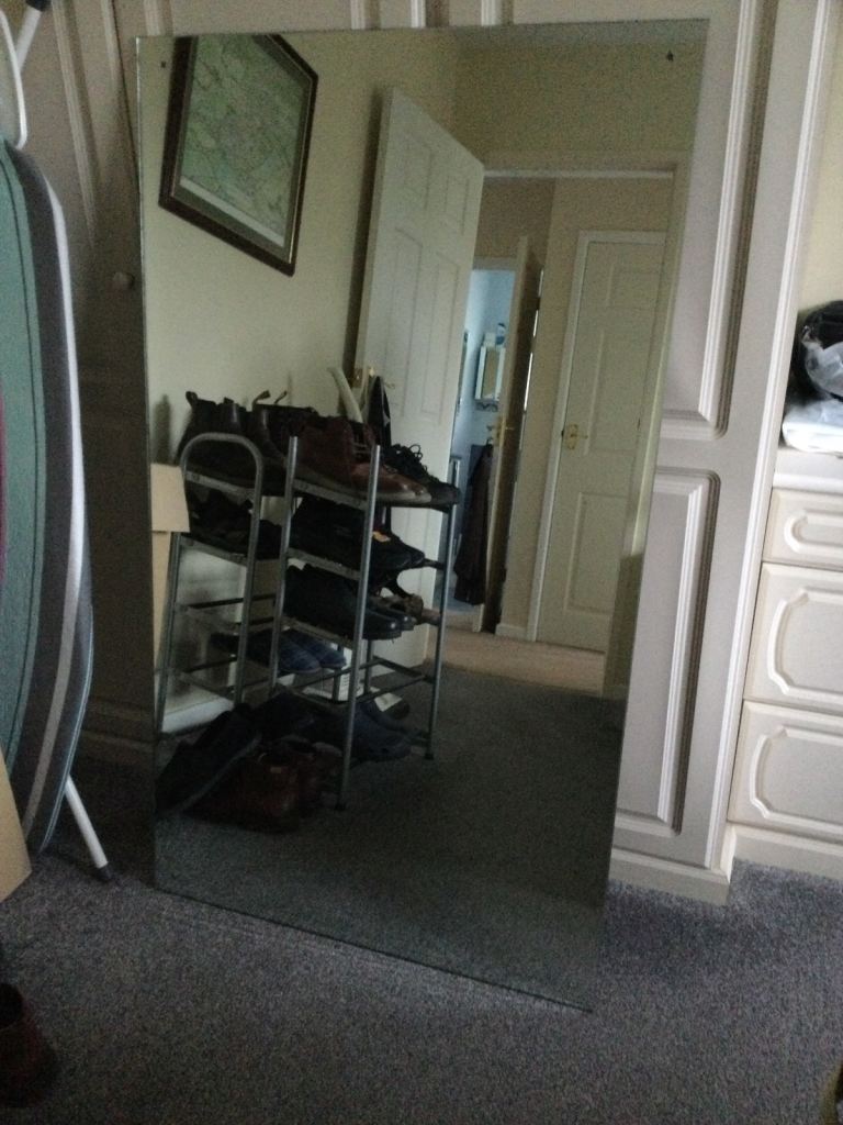 Plain large mirror. Excellent condition - no marks or chips. Size 120cm x 45cm. Has 4x holes for fixing to a wall but we had used it hanging up with a picture cord. The corner protectors can be taken off easily. Open to offers. Collection