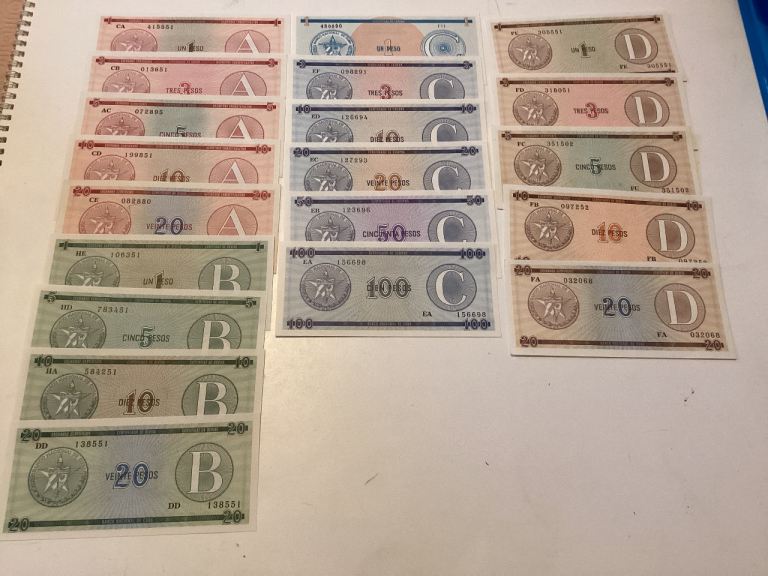 Group of Cuban Foreign Exchange Certificates. All in uncirculated condition. Series A, B, C and D Various denominations…..see photos 20 Notes/Certificates in total Rare and very unusual collection