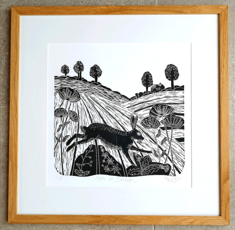 Two limited edition (print runs of 35 each) linocut prints in black ink, the Owl with yellow detailing. By Cambridgeshire print maker Anna Pye. Originally £300 for the pair from the artist's studio. The Owl is 30 x 30 cm and the Hare at Burrough is 3