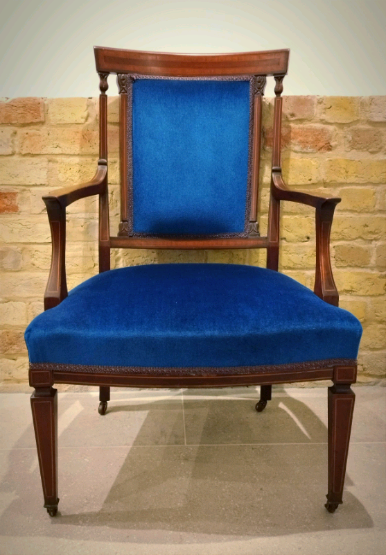 Attractive library chair in the 18th century Sheraton Revival style. Made from mahogany with decorative inlays of lighter wood and hand carving on the sides of the backrest. Covered in a royal blue velvet with a comfortable sprung seat, the chair sui