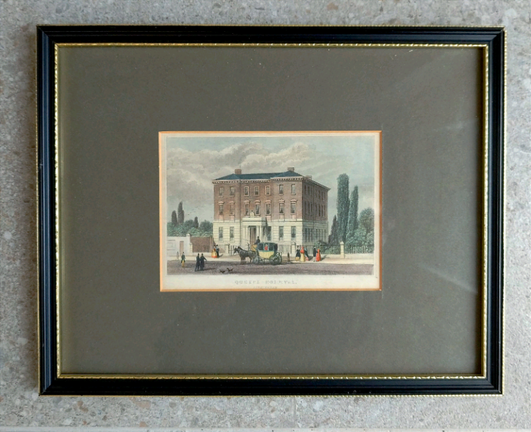 Queens Hospital Birmingham. 18th century tinted engraving. 14x10cm in a black and gold frame (30x24cm)