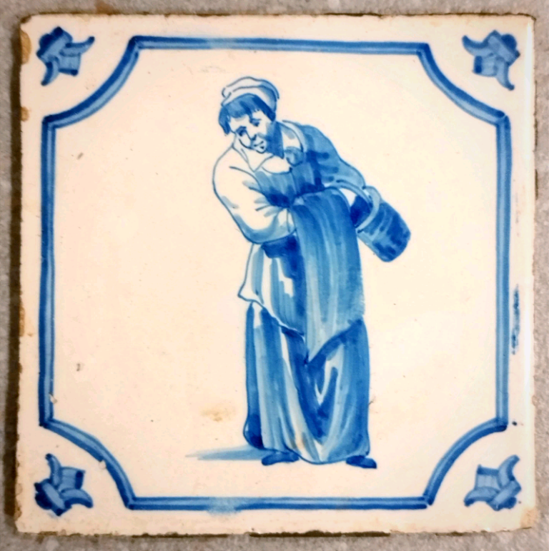 18th or 19th century Dutch blue and white Delft tile of woman working. 130mm square, 8mm thick. Weighs 220g. A few small chips on the edges, but otherwise good condition.