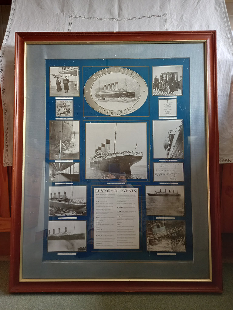 Attic find: Framed 'History of Events' print of R.M.S. Titanic Liverpool Dimensions: 103cm x 81cm x 3cm Glass front + backboard in great condition Collection in person preferable