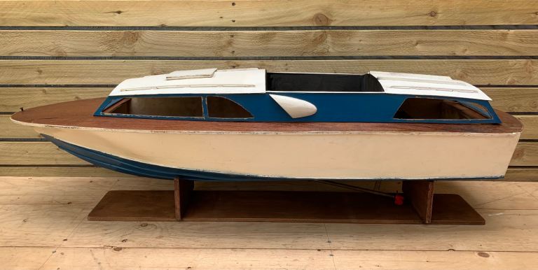Vintage Scratch Built Model Pond Yacht Motor Boat Cruiser on Stand 1960s 70s PLEASE DO FOLLOW US ON INSTAGRAM & FACEBOOK MARKET PLACE @clarksoncollection Mid Century Period Piece Large Vintage Scratch Built Model Pond Yacht Motor Boat Cruiser on