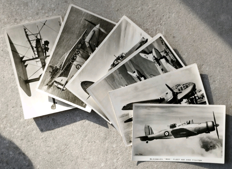 Vintage Valentine's postcards of military aeroplanes from WW1, WW2 and later. Shown here a selection of 6 including: Hawker Osprey, Vickers Vildebeste, Hawker Henley, Airspeed Oxfords, Bristol Beaufort, and Blackburn "ROC". These are from a