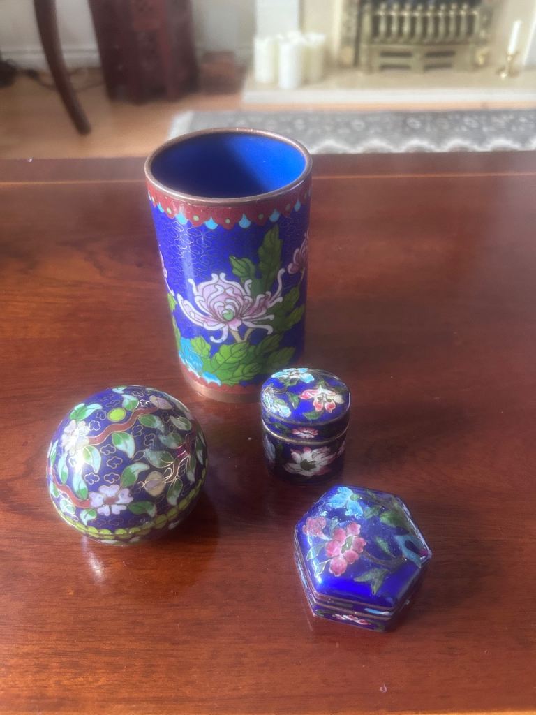 Four matching Chinese Cloisonné enamel dishes including pen/pencil brush can