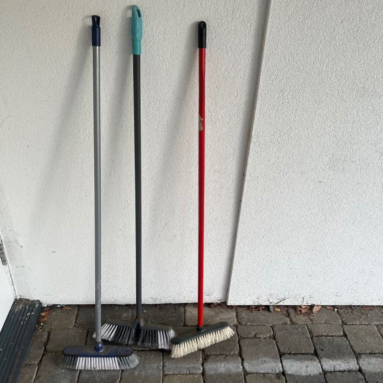 Three sturdy brooms/brushes. 2 to give away and want to keep one of them. You can take just 1 if you want. They are all in good working order with plenty of life left in the bristles. One broom is red, one is grey, and the other is dark grey with a