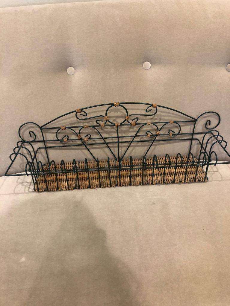 Dark green metal and rattan storage basket. Decorative and useful. Length 53cm. Back height 19cm. Front height 11cm.