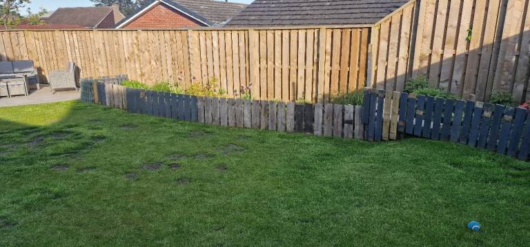 Hand made garden fence used to keep puppy out of borders (lower fence in pictures). Made from repurposed old fencing. Could also be used as enclosure for dogs, rabbits, guinea pigs etc. About 40-50 ft in total length. Vertical planks are 60cm high. J