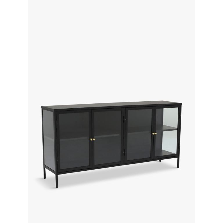 Barker and Stonehouse Salinas 4 Door Glazed Sideboard Black Very good condition Black metal frame, glass panels and gold knob handles 1700 mm W x 400 mm D x 850 mm H