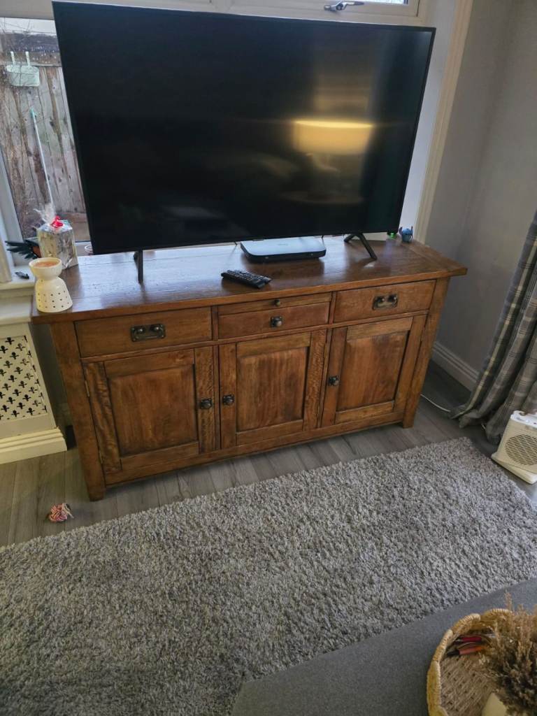Oak Furniture Land Bevel solid oak large sideboard ! In excellent condition ! Triple door cupboard with shelf and 3 drawers above ! 100% solid oak ! Holes have been drilled into the back for cables , these obviously can’t be seen unless the do