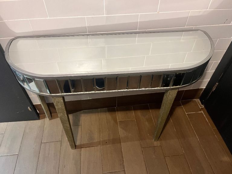 Glass slim table quite glitzy need a bit of attention but sturdy. Good up cycle opportunity W112 H76 D36