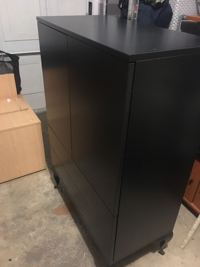 Black wooden side cupboard / filing cabinet. Decent condition with soft closing drawers and doors. 1200mm high. 800mm long and 400mm deep. Very handy for storage. Collection only and it’s rather heavy so two person job.