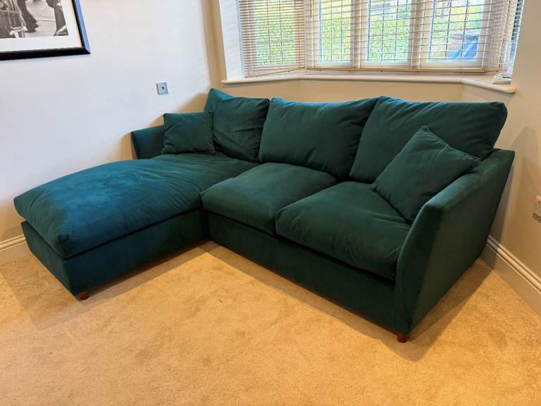 Luxury 4 seater Chaise Sofa bed in velvet green (Willow and Hall Ansty House Collection Emerald) Lightly used, handmade 4 seater chaise type sofa with integral pull out bed (equivalent to a small double). Purchased April 2025 (15 months old). So