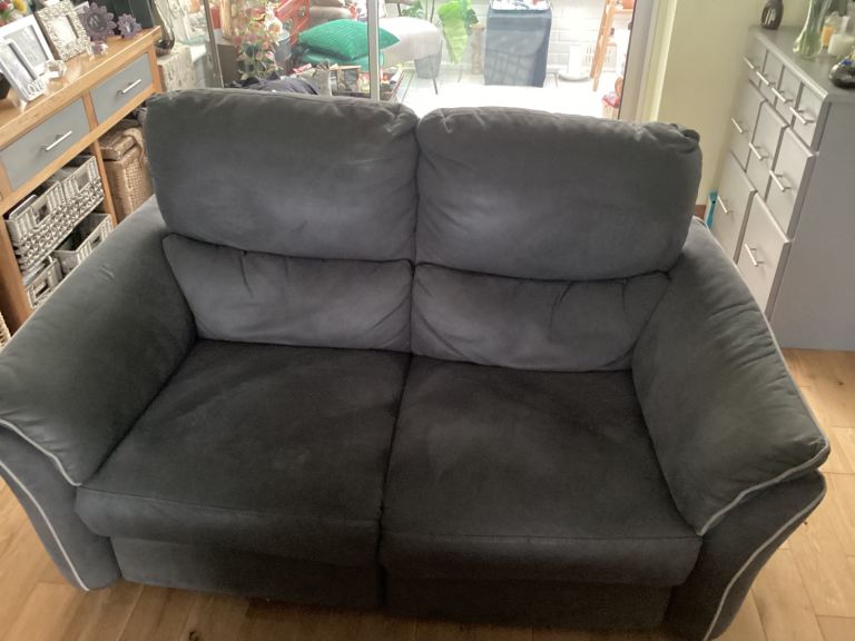 Two grey power recliner sofas. Both two seaters. No issues with the recling mechanism. No rips or marks. For transportation they separate in the middle. Faux suede. Wide= 64” Deep =38” High =38” (At back)