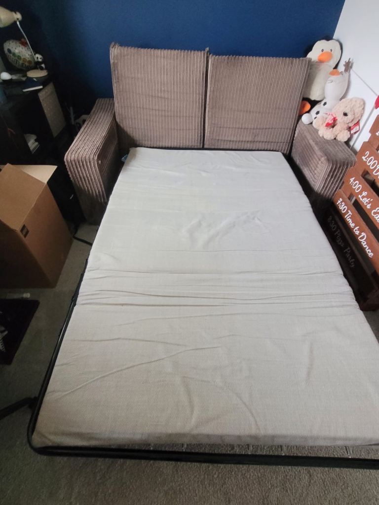 Brown cotton sofabed available free of charge. Only external cotton needs covering due to cat scratches but bed inside is on perfect condition and hardly sued.