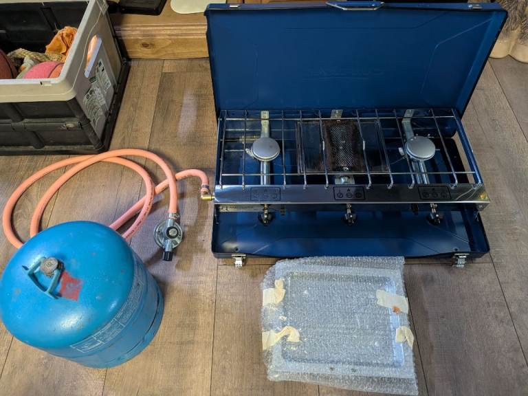 Campingaz chef cooker with unused grill Brand new last year and used for a weekend so still perfect Brand new hose and regulator Also 3 quarter full bottle of gas £50 grab a bargain as the bottle of gas will cost that alone